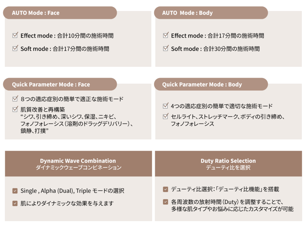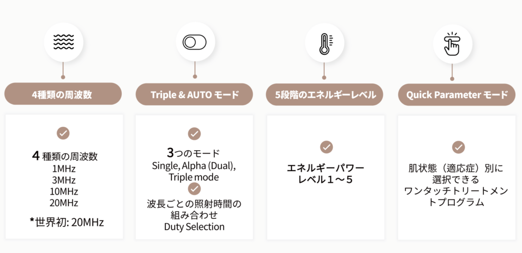 シングル/デュアル/トリプルの周波数選択で、より多様なニーズに合わせたカスタム施術が可能。