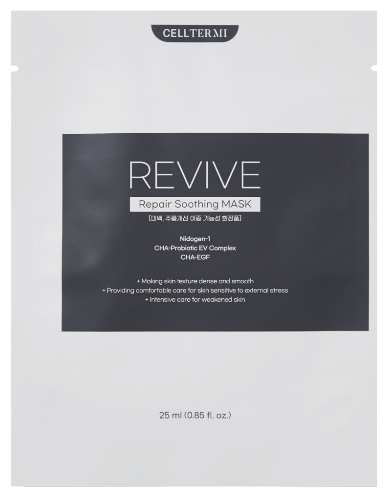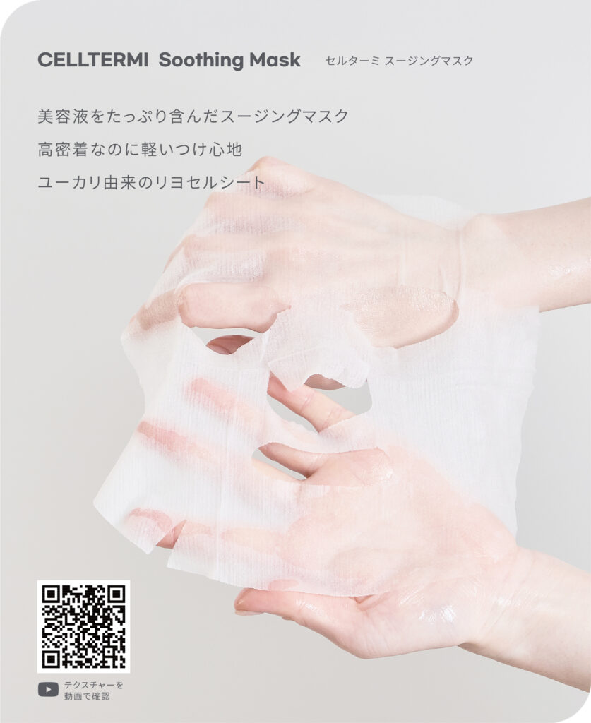 セルターミ S マスク(CELLTERMI S MASK)は、ユーカリ由来のリヨセルシートに、CHAMEDITECH社開発の特許成分「CHA-Nidogen-1」、2種のEV(乳酸桿菌細胞外小胞/エンテロコッカス・ロタイ細胞外小胞)、ペプチド(EGF、〈SH-オリゴペプチド-1〉含む)、セラミドNP、ヒアルロン酸を組み合わせた、プレミアム保湿・コンディショニングシートマスクです。